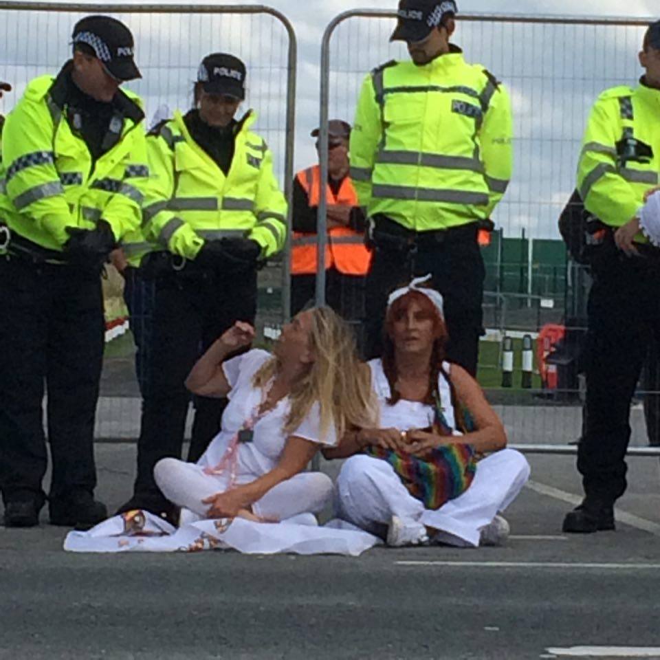 Today I woke to an entirely different scene (livestream uploaded to YouTube)… the police gathered outside the entrance to the Community Hub at Maple Farm to hold us in place as a convoy passed – they always do this to ensure no-one tries to exercise articles 10 & 11 of the Human Rights Act and use non violent direct action to protest. This morning was particularly aggressive one small woman apparently approached a delivery vehicle and I witnessed the police chase her into the entrance of Maple Farm. They caught her and threw her to the stony-gravel ground with the weight of the officers on her tiny back pressing her down. Naturally those around her rushed in defense – NONE applying violence, only shouts; stronger male Protectors were tousled with by the large number of police. The scene was ugly, disproportionate and a complete mess of policing – no control, no order, no attempt at dialogue – just out and out brutality and tragically, a vile sense of pleasure in some of the police faces.
