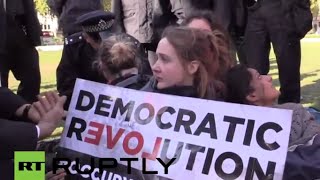 From the 17th October 2014 Occupy Democracy held a ten-day occupation outside the Houses of Parliament to highlight the deficit in our democracy. During that time protesters faced increasingly oppressive and violent tactics from the Metropolitan Police aiming to suppress the protest. These tactics included kettling, intimidation, confiscation of property, inflicting pain through use of pressure points and pulling protesters across the ground.[2]